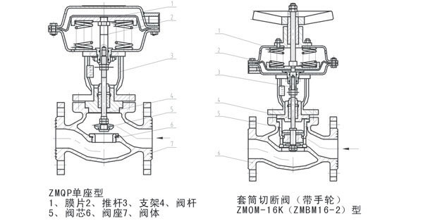 2.ZMQM:气动薄膜套筒切断阀,如:ZMQM-16K:K:气开式;M:阀芯型式,套筒;B:气闭式