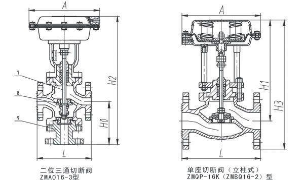 3.ZMAQ16-3:气动薄膜三通切断阀;A:正作用