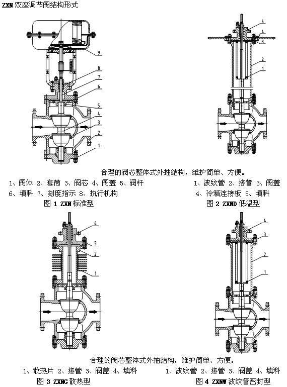 有两个阀芯和阀座,采用“四通”阀体,可以方便地由正装改装成反装,气关阀变气开阀。