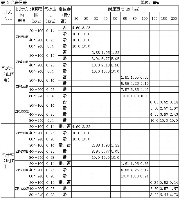 注 1)对于ZXNW型双座波纹管密封调节阀,最大允许压差为1.0MPa,表中数据若数值小于1.0MPa则不变,若数值大于1.0MPa,则取值1.0MPa。